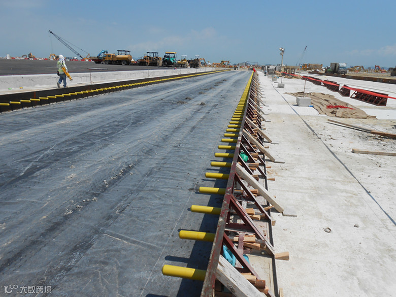 传力杆直径为 40 mm、长度为 500 mm,每个机轮压力能在混凝土板块上得以平均分配。整个混凝土道面的表面平整度必须满足香港国际机场的标准,因此,必须采用严格的质量控制流程。最后,还要用人工拉毛的方法对混凝土表面进行粗糙度处理。