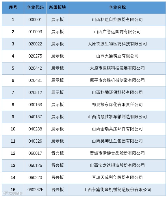 专精特新“小巨人”企业是“专精特新”中小企业中的佼佼者,是专注于细分市场、创新能力强、市场占有率高、掌握关键核心技术、质量效益优的排头兵企业。本次获得省级“专精特新”小巨人企业认定的15家中心挂牌展示企业中,晋兴板企业4家、展示板企业11家,其中“科达自控”、“锦波生物”、“科腾环保”3家企业已推送至新三板,15家企业涵盖了软件和信息技术服务业、医药制造业、化学原料和化学制品制造业等行业,集中展现了中心“专精特新”企业的发展水平和实力。