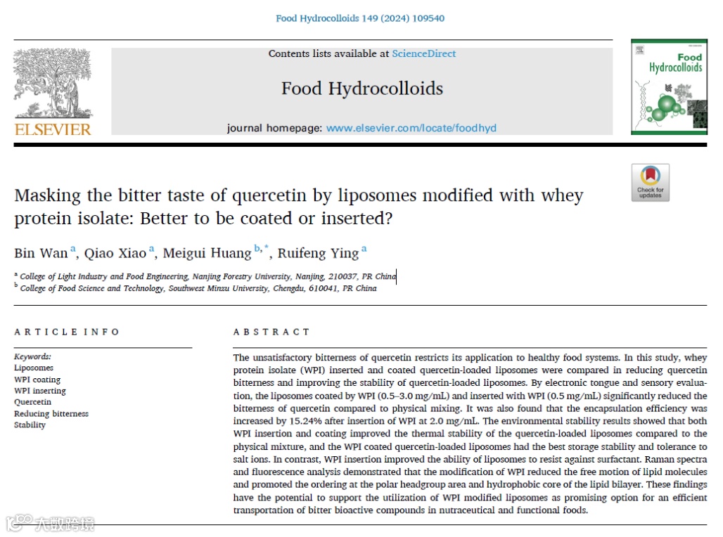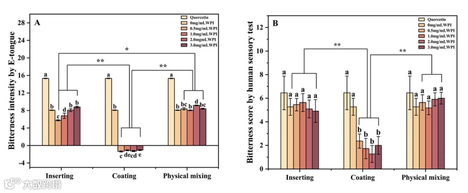 如图2A所示,WPI包被槲皮素脂质体后,槲皮素的苦味值显著降低。感官评估也得到了类似的结果(图2B)。槲皮素苦味的降低与WPI涂层中β-LG的存在有关。据报道,WPI主要由β-LG组成,它主要通过疏水相互作用结合小分子(Tenney, Hayes, Euston, Elias, & Coupland, 2017)。生成的β-LG纳米颗粒复合物与表没食子儿茶素没食子酸酯(EGCG)结合进行热变性,随后减少了苦味和涩味(Lestringant, Guri, g lseren, Relkin, & Corredig, 2014)。我们推测WPI包被修饰可以有效防止槲皮素泄漏,减少槲皮素与口腔苦味受体的接触,这也是导致苦味值显著降低的一个因素。我们还发现WPI插入槲皮素脂质体略微降低了苦味。槲皮素深埋于脂质体的疏水核心(Huang et al., 2017), WPI插入修饰增加了槲皮素的有效负载,减少了游离的槲皮素,因此与负载槲皮素的脂质体相比,苦味降低。与负载槲皮素的WPI包被脂质体相比,WPI在静力作用下聚集成膜,阻止了槲皮素与味觉受体接触(Liu et al., 2017)。在人类和电子舌头无法完全感知的范围内。然而,WPI插入改性没有形成致密的保护膜,因此它不像WPI涂层改性那样掩盖苦味。