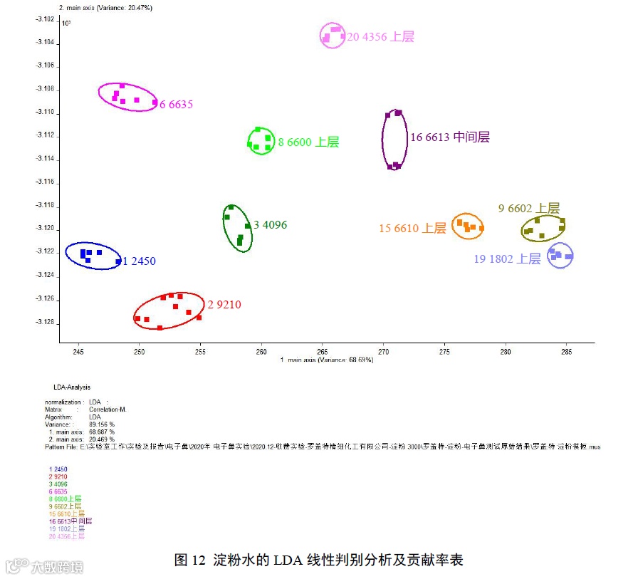LDA是DFA(识别因子法)的第一步,LDA分析注重类别的分类以及各种组之间的距离分析,简单的说在LDA分析中会尽量缩小组内的差异,扩大组间的差异。缩小组内差异后组间的差异变得更加明显,10个淀粉样品的趋势与PCA图相似,同样可见9、15、19三个分布在X轴较远的位置,1、2接近于0点,其他样品分散在中间。