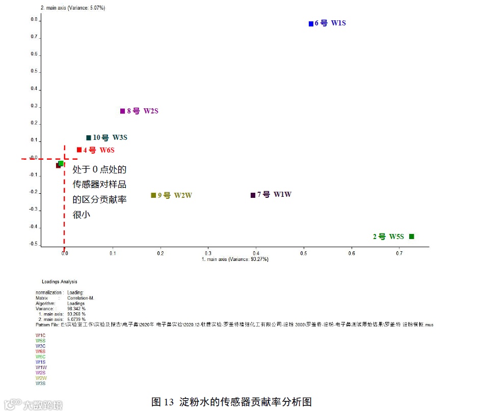 Loadings分析法与PCA是相关的,它们都基于同一种算法,但不同的是,本实验中Loadings算法主要是对传感器进行研究,利用该方法可以确认特定实验样品下各传感器对样品区分的贡献率大小,从而可以考察在这个样品区分过程中哪一类气体起了主要区分作用。
