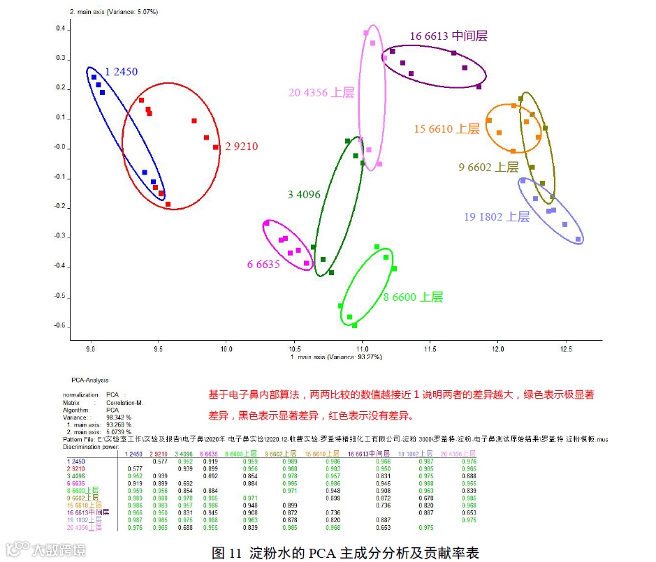 从图11可见,PCA主成分分析第一和第二主成份贡献率之和接近98.342%,基本上涵盖了样本的大部分原始信息,其中第一主成分的贡献率为93.268%,第二主成分的贡献率为5.0739%,可见样品之间的差异主要表现在第一主成分上。结合PCA区分度分析表(根据电子鼻软件内部的计算方式得到,数值越接近于1说明样品的区分越显著)。
