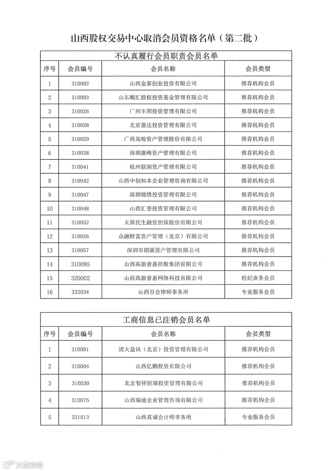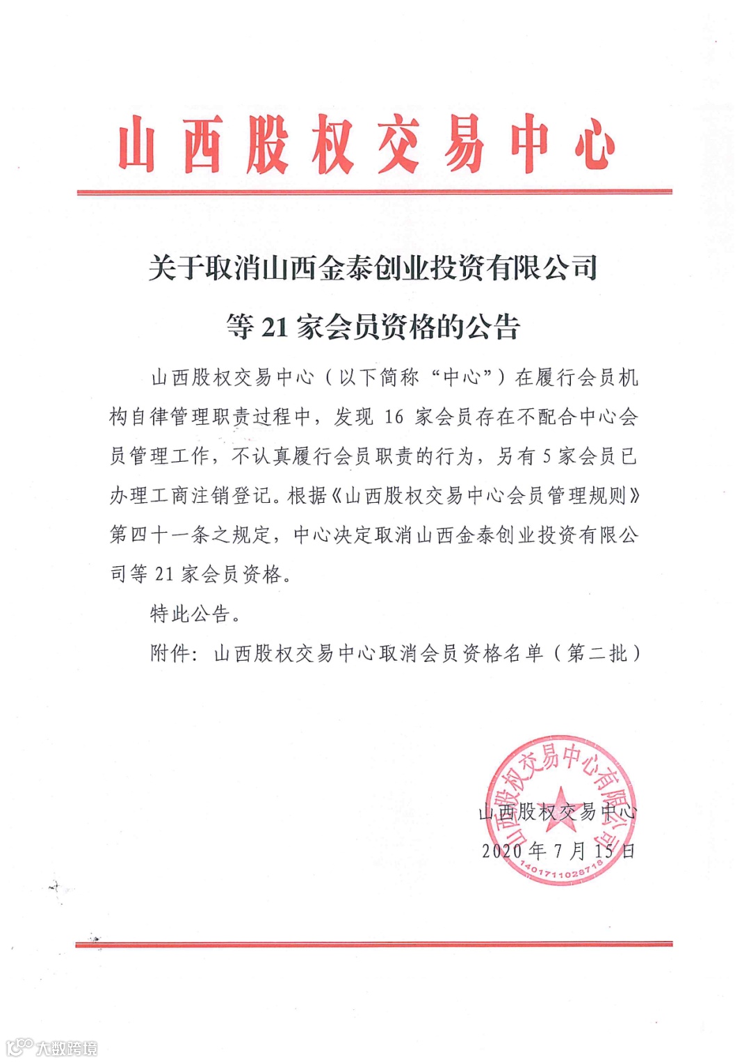 关于取消山西金泰创业投资有限公司等21家会员资格的公告