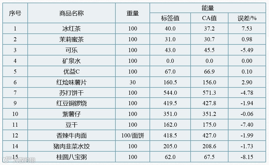 CA值:卡路里测定仪测试结果