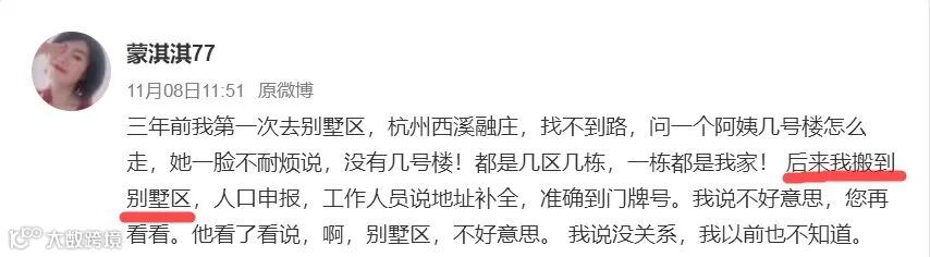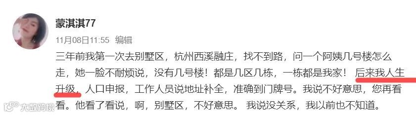 “三年前我第一次去别墅区,杭州西溪融庄,问阿姨住几楼啊?她一脸不耐烦地说,没有几楼!都是几区几栋,一栋都是我家!