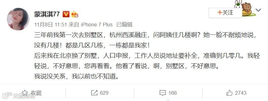 原微博写的是“后来我搬到别墅区”——一个“搬”,就说明以前住不起别墅,有点少见多怪的意味,不够高大上。