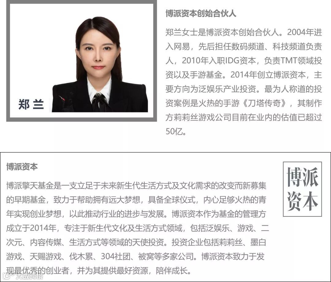 郑兰国内最富盛名的女性投资人之一,拥有超过8年的游戏、娱乐投资经验。她在2010年于IDG负责手游基金,2014年创立博派资本,是业内顶尖的游戏投资公司。其投资的莉莉丝游戏公司(代表作:刀塔传奇)目前已经估值50亿。
