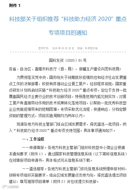 1、科技部“科技助力经济2020”重点专项项目的通知