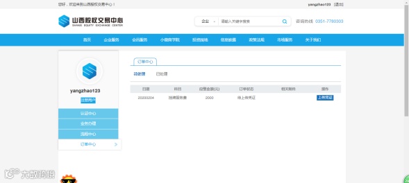 2、按照订单金额缴纳挂牌费用,缴费后,点击“上传凭证”,上传银行缴费凭证,填写发票信息。