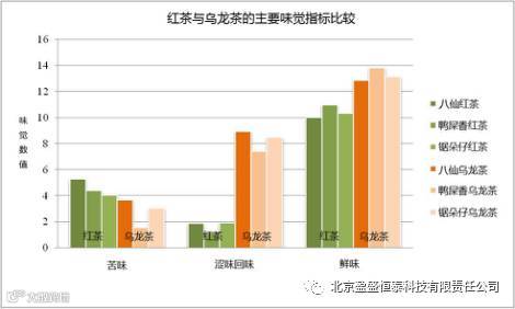 乌龙茶与红茶苦味较为接近,但红茶普遍要更苦一些,苦味也是红茶滋味醇厚的重要体现。乌龙茶为半发酵茶,而红茶为发酵茶,由于发酵程度不同二者在涩味上存在巨大差异,半发酵的乌龙茶因为茶多酚含量较高,比对应的红茶表现出强烈的涩味回味(又称涩味后味)。鲜味则对应了茶汤的鲜爽口感,主要反应了茶中氨基酸的情况,从下图中可知完全发酵使得茶中氨基酸含量发生变化,故而红茶的鲜味要低于相应的乌龙茶。尺有所长,寸有所短,日本INSENT电子舌根据韦伯费希纳定律建立味觉标尺将复杂抽象、难以言说的味道数值化,使得红茶与乌龙茶在滋味上的秘密也随之浮出水面。
