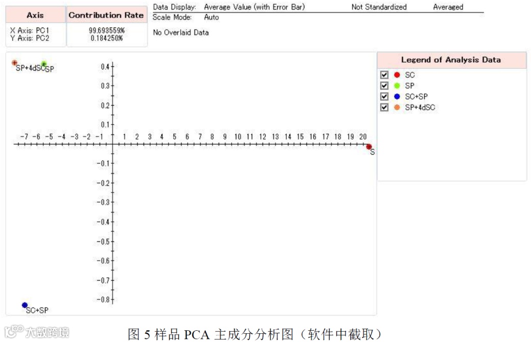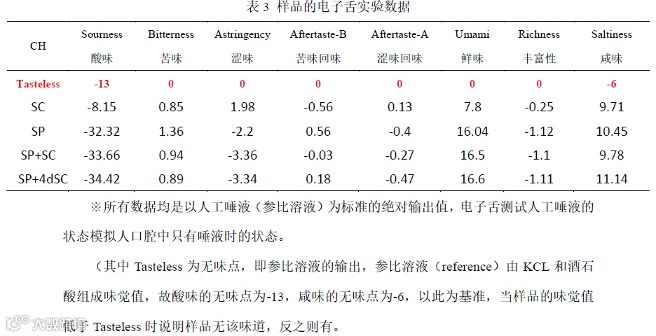 本次测试果酒样品测试结果主要味觉指标为鲜味、咸味和苦味,根据各图形和PCA分析结果可以发现SP与SP+4dSC样品接近,SC与其他样品差异较大。差异主要在酸味上。以上结果需要与样品本身特征进行结合分析。
