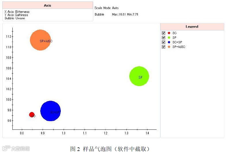 从图2中可以看到样品苦味和咸味为横纵坐标,鲜味为气泡大小的对比情况。