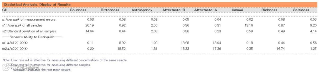 上图中,g为平均误差;s1为所有样品的平均值;s2为所有样品的标准偏差;m2用以判定不同样品的误差率,反映传感器的区分能力(值越低样品的区分性越好)误差率(m2值):将样品整体偏差作为100%,而后求样品测定误差与其的比率。