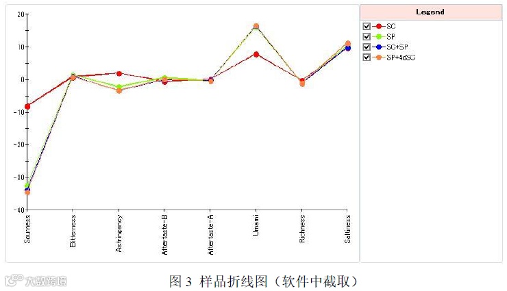 图3为样品以横坐标各个味道在纵坐标上的数值比较,通过折线连接,比较味道上差异情况。