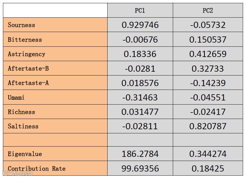 PCA主成分分析为一种常用的统计分析方法。选取主要味觉指标进行分析得出结果如图,主成分1和2为横、纵坐标轴,方差贡献率为99.69%和0.18%,对样品进行聚类分析,结果如下图5所示。从图中可见,样品间的距离越小,说明综合味觉较为接近,反之,样品味觉差异较大。结合PCA传感器贡献率表可见,第一主成分贡献率很高可以不考虑其他主成分的影响以第一主成分进行分析。