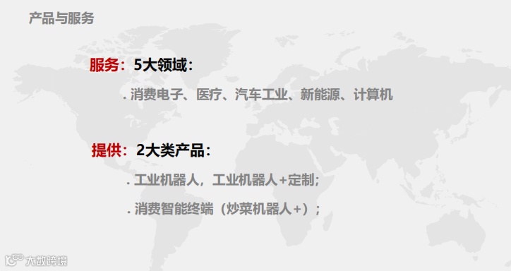 公司的智能装备业务目前有两个板块:一是工业机器人与工业机器人+定制业务;二是消费智能终端:炒菜机器人(商用版、家用版)与煮饭机器人业务。