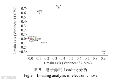 由图9电子鼻的Loading分析可以看出,PC1和PC2传感器的贡献率分别为87.56%、11.07%,总贡献率为98.63%,在主成分1(PC1)贡献率方面,传感器W1S的贡献率最大,其次是传感器W1W;而在主成分2(PC2)贡献率方面,传感器W1W的贡献率最大,其次是传感器W2W。说明第一主成分主要反映的是对甲基类,其次是无机硫化物,第二主成分主要反映的是无机硫化合物,其次是芳香成分、有机硫化合物。