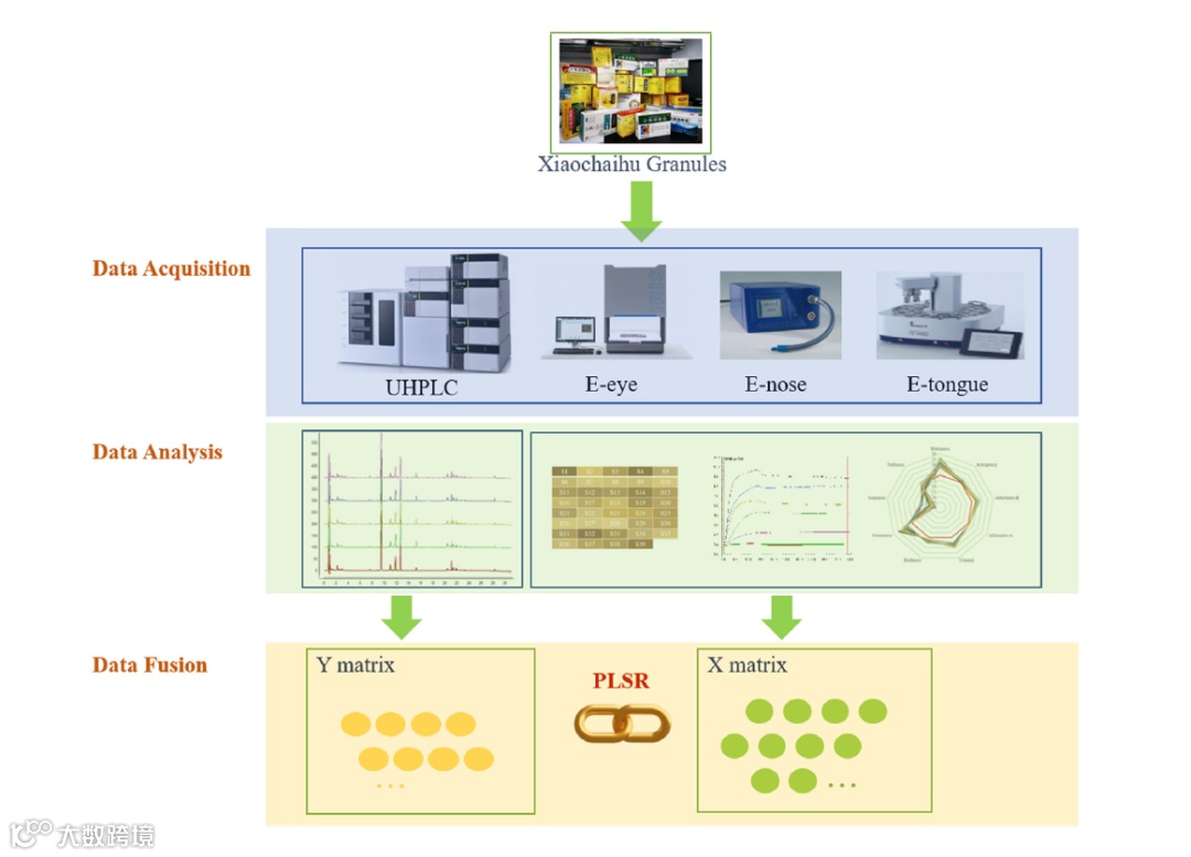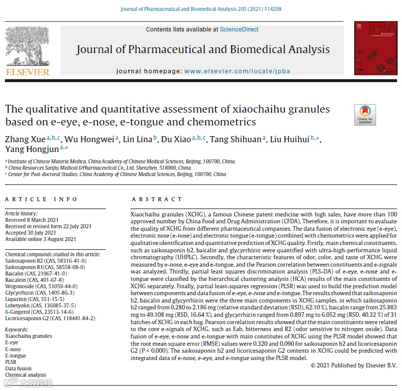 “中国中医科学院中药研究所”应用电子眼(e-eye)、电子鼻(e-nose)和电子舌(e-tongue)数据融合技术,结合化学计量学对XCHG质量进行定性鉴定和定量预测。结果表明,柴胡皂苷b2、黄芩苷和甘草酸苷是XCHG样品的主要成分。其中柴草皂苷b2的相对标准偏差为0.280~2.186mg(RSD为62.10%),黄芩苷的相对标准偏差为25.883~49.108mg(RSD为16.64%),甘草酸的相对标准偏差为0.897~6.052mg(RSD为40.32%)。Pearson相关结果显示,主要成分与XCHG的核心电子信号有关,如Eab、苦味和R2(对氮氧化物敏感的气味)。