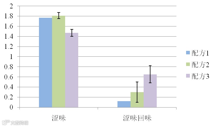 涩味回味反映了样品涩味的残留情况。火锅底料中的涩味可能来源于配方中调味料、辛香料的添加。从图中可见,配方1、2的涩味也略高于配方3,但不同配方的涩味差异在0.5个刻度之内,一般人们很难分辨其差异。此次,配方3的涩味回味要高于配方1、2,但数值较小。