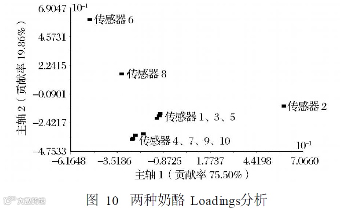 Loadings分析是为了识别传感器对于模型区分的重要性。传感器的负载参数越是接近零,说明此传感器对于整体指纹信息贡献越小,相反值越大则贡献越大。图10表明,传感器2、6和8在当前模板下起的作用较大,而其他传感器作用较小。从Loadings分析图可以帮助进一步研究传感器对于奶酪气味响应值和优化传感器建模。