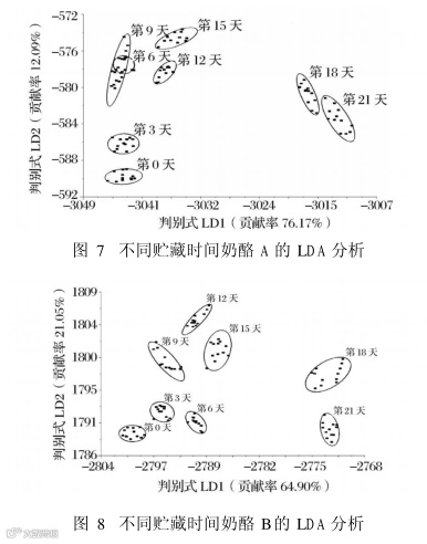 随着贮藏时间的延长,与新鲜奶酪的距离越来越远;2种奶酪的数据采集点都呈现相同的规律,即从图的左下侧按顺时针方向变化到图的右下侧。由于LDA分析方法注重气味速率(图7、图8中各类中心点之间的距离)变化分析,所以从图7中可以看出奶酪气味的变化速率。以奶酪A为例,可以看出,从第0天到第3天速率变化较小,但从第3天到第6天的过程中速率变化明显变大,而从第6天到第15天的速率变化相对比较稳定,由于第18天和第21天的奶酪在感官上已经几乎不能接受,所以和其他贮藏期奶酪很明显隔离了。奶酪B也有类似的速率变化规律出现。
