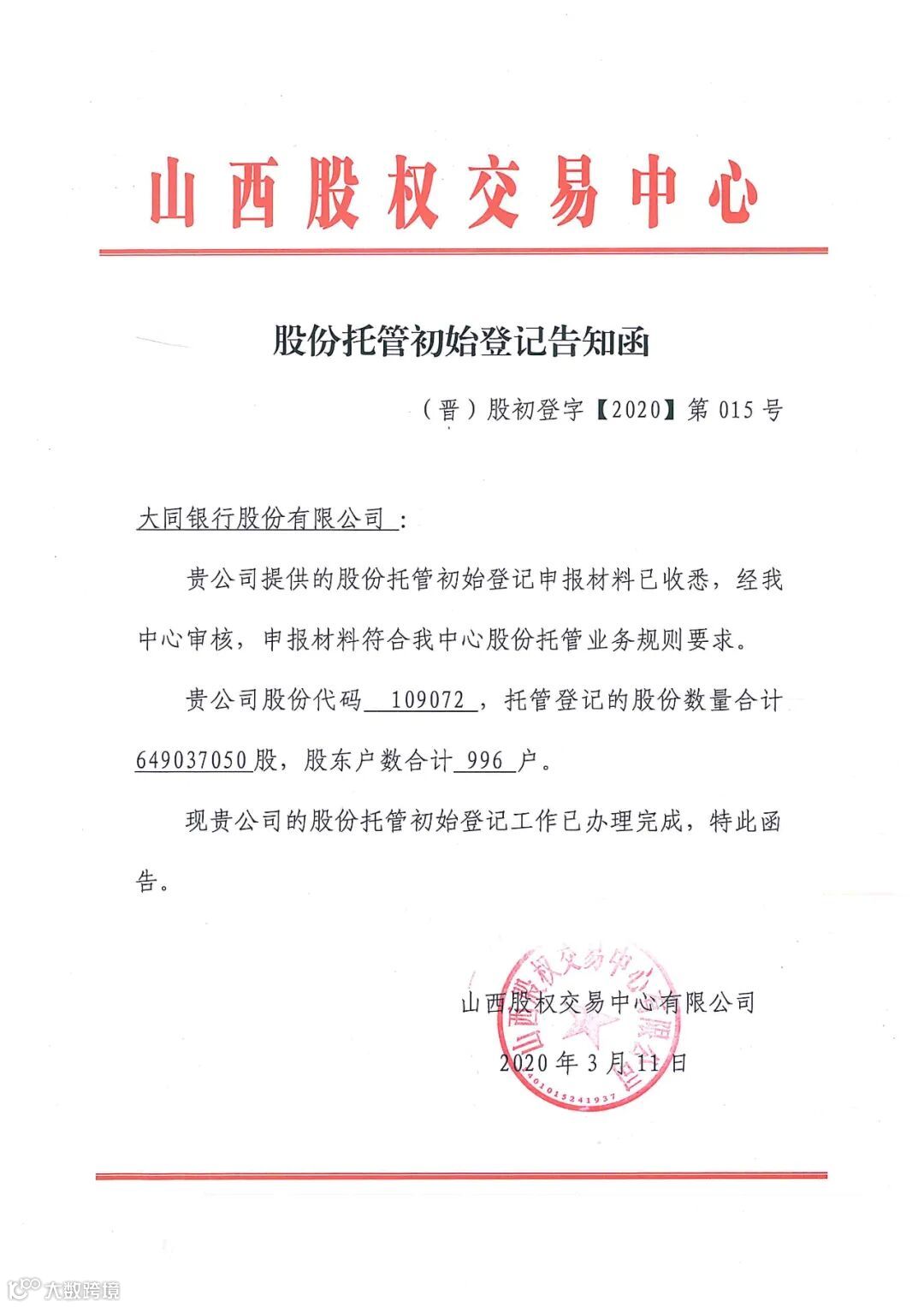 大同银行股份有限公司托管公告