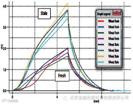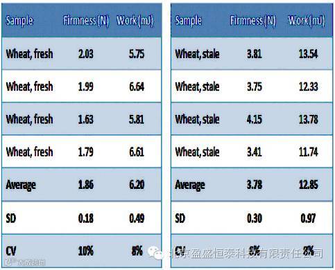 由图1可见,新鲜面包和放置过夜的面包在硬度上差异显著,放置过夜的面包硬度几乎是新鲜面包的两倍(图形中的峰值为面包硬度)。图形中不仅展示了新鲜面包和放置过夜面包的硬度,还显示了两类样品在整个压缩过程中的力量变化,通过此图我们还可以了解到更多的关于样品质地的信息。硬度与做功数据清晰的说明放置过夜后咀嚼该面包会耗费更多的能量;图2中CV<10%也说明质构仪提供了一个有效的方法用于客观的测试储存时间对切片面包质地的影响。通过测试我们也发现质构仪还可以用于测试储存条件、包装材料等对样品货架期的影响。