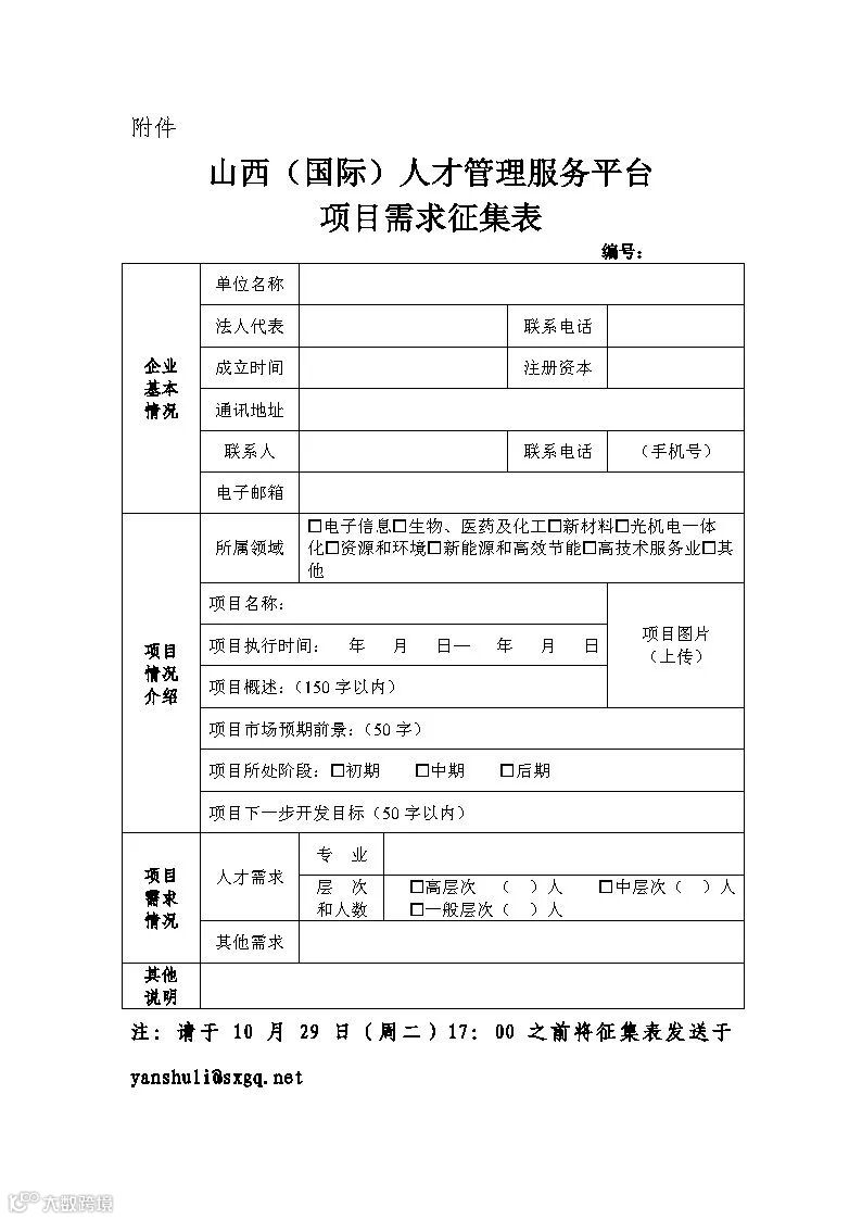 有人才需求的挂牌企业请按附件要求认真填报《山西(国际)人才管理服务平台项目需求征集表》。