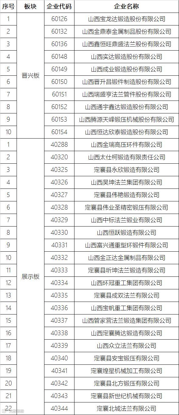 定襄是全国闻名的锻造之乡,法兰产量占全国产量的30%,风力发电塔筒法兰占全国产量的60%以上,锻钢法兰年出口量占全国的70%。近年来,定襄县认真落实市委提出的“推动工业4.0建设和打造百亿元级支柱产业”的要求,把法兰锻造产业转型升级作为全县经济转型发展的重中之重,组织成立了法兰锻造协会,率先实施“煤改气”,紧抓整合重组、创新管理两个重点,全力推进“12427”改革。定襄法兰锻造产业真正进入了做强的时代,世界法兰锻造之都正在逐步形成。此次挂牌的32家企业中, “展示板”有22家, “晋兴板”企业10家,都是定襄县法兰锻造行业的优秀企业代表。