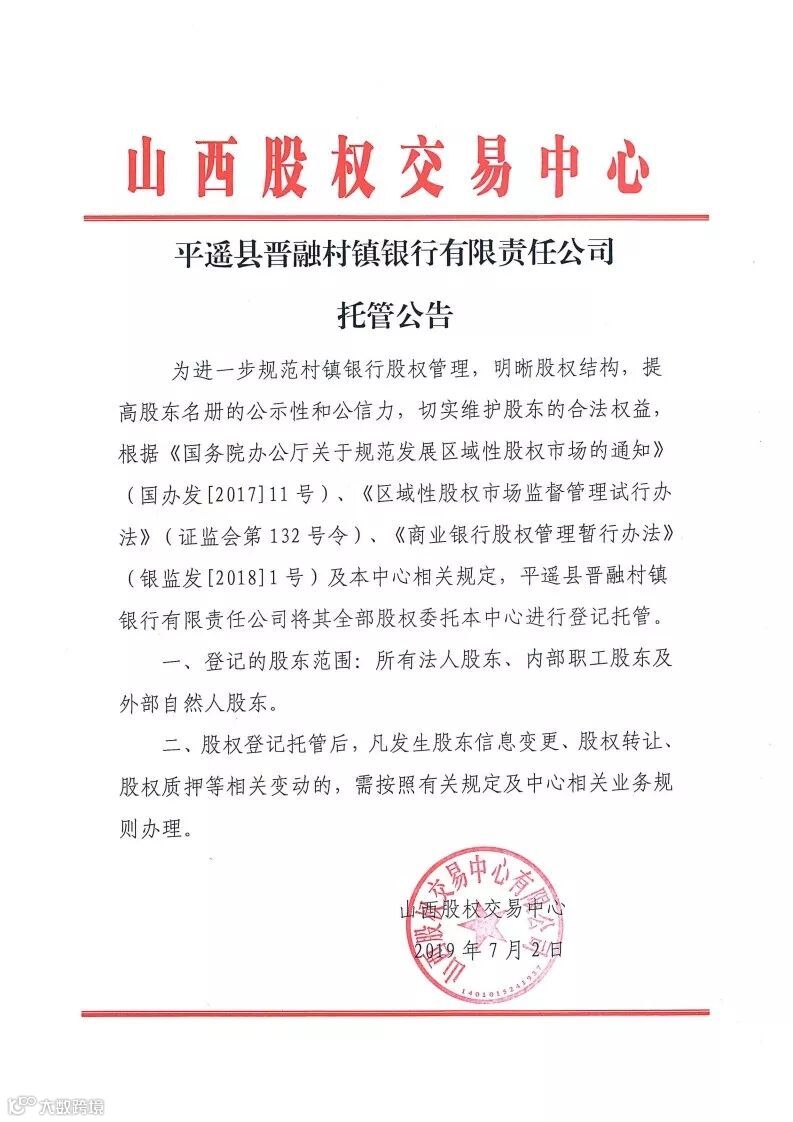 平遥县晋融村镇银行有限责任公司托管公告