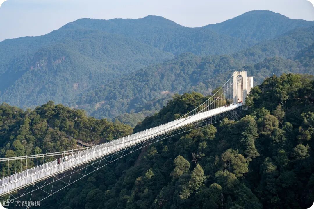 玻璃天桥上脚下是深不见底的山谷,U形悬空栈道更是让人心跳加速,站在上面,眼前是辽阔的林海和山色,让人在刺激中感受到视觉的震撼。