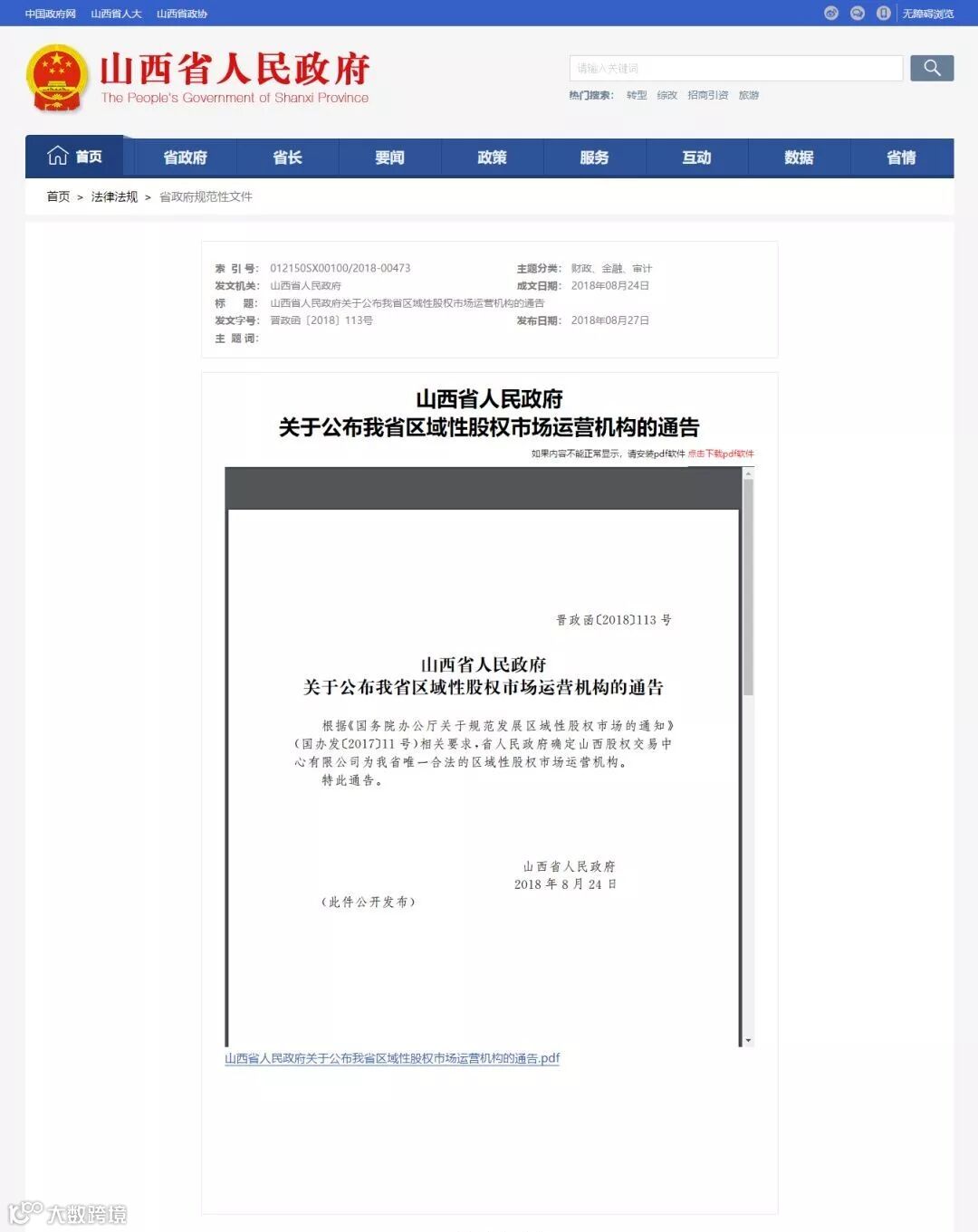 2018年8月27日,山西省人民政府发布《关于公布我省区域性股权市场运营机构的通告》(晋政函〔2018〕113号),明确山西股权交易中心有限公司为山西省区域性股权市场唯一合法运营机构。