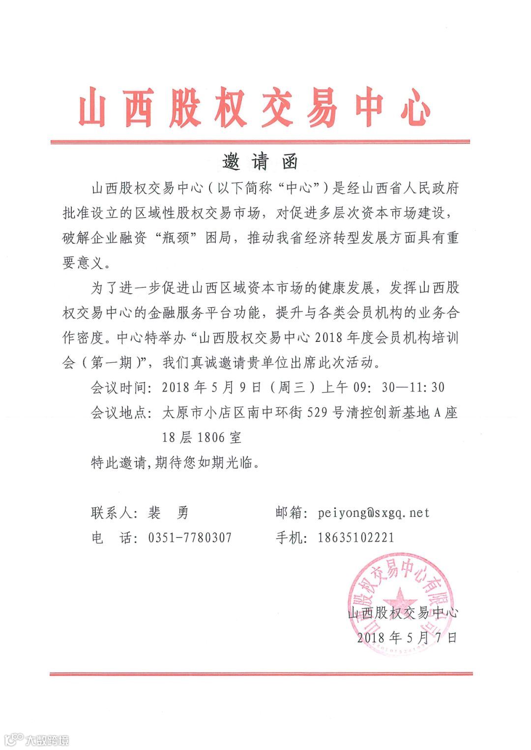 山西股权交易中心2018年度第一期会员机构培训会邀请函