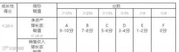 以上两个指标分别对照下表评价档次(ABCDEF)得出分值,两项得分相加计算出企业成长性指标综合得分。