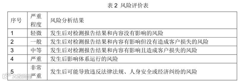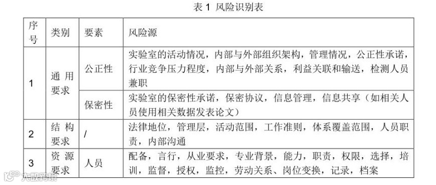 风险源主要从通用要求、结构要求、资源要求、过程要求、管理体系要求、 其他要求等六个方面识别。具体见表1