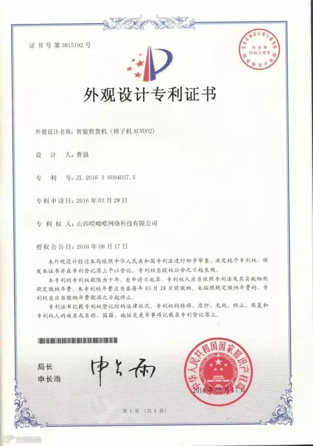 “外观设计专利证书”专利名称:智能售货机(格子机AUV002)