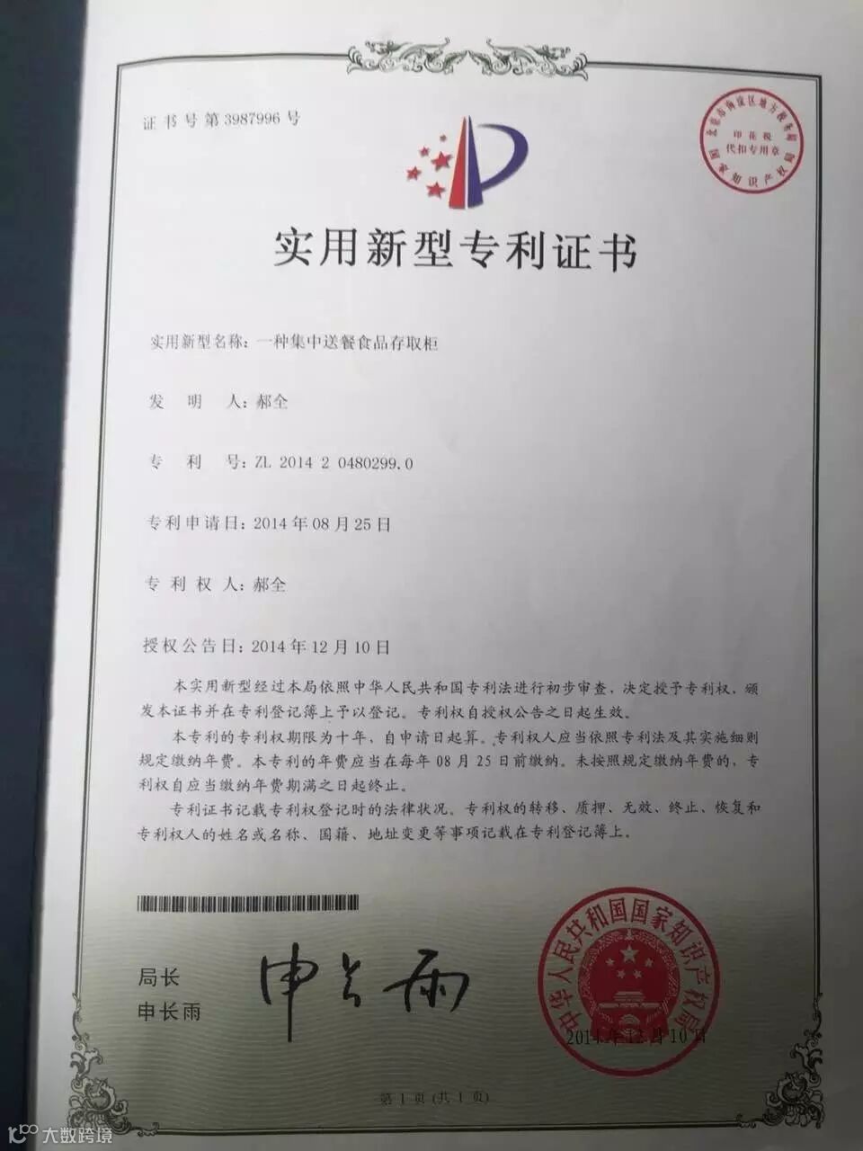 “实用新型专利证书”实用新型名称:一种集中送餐食品存取柜。