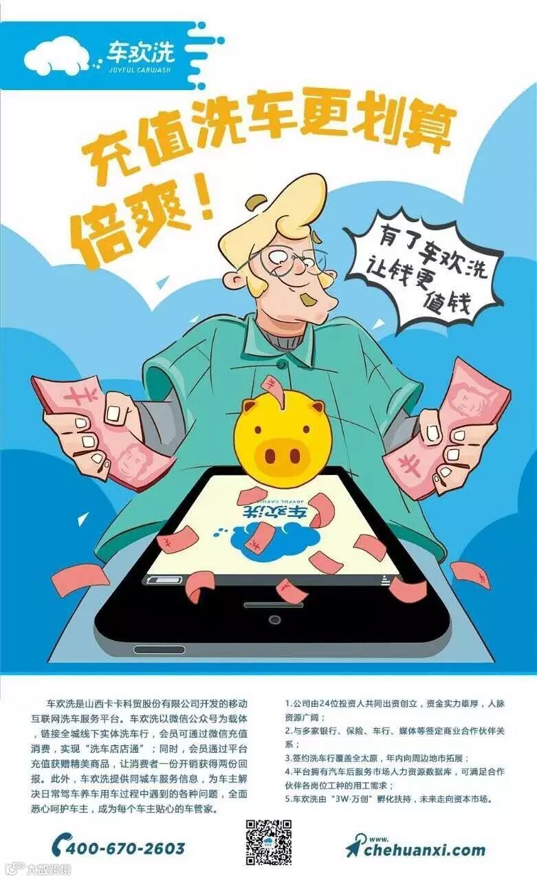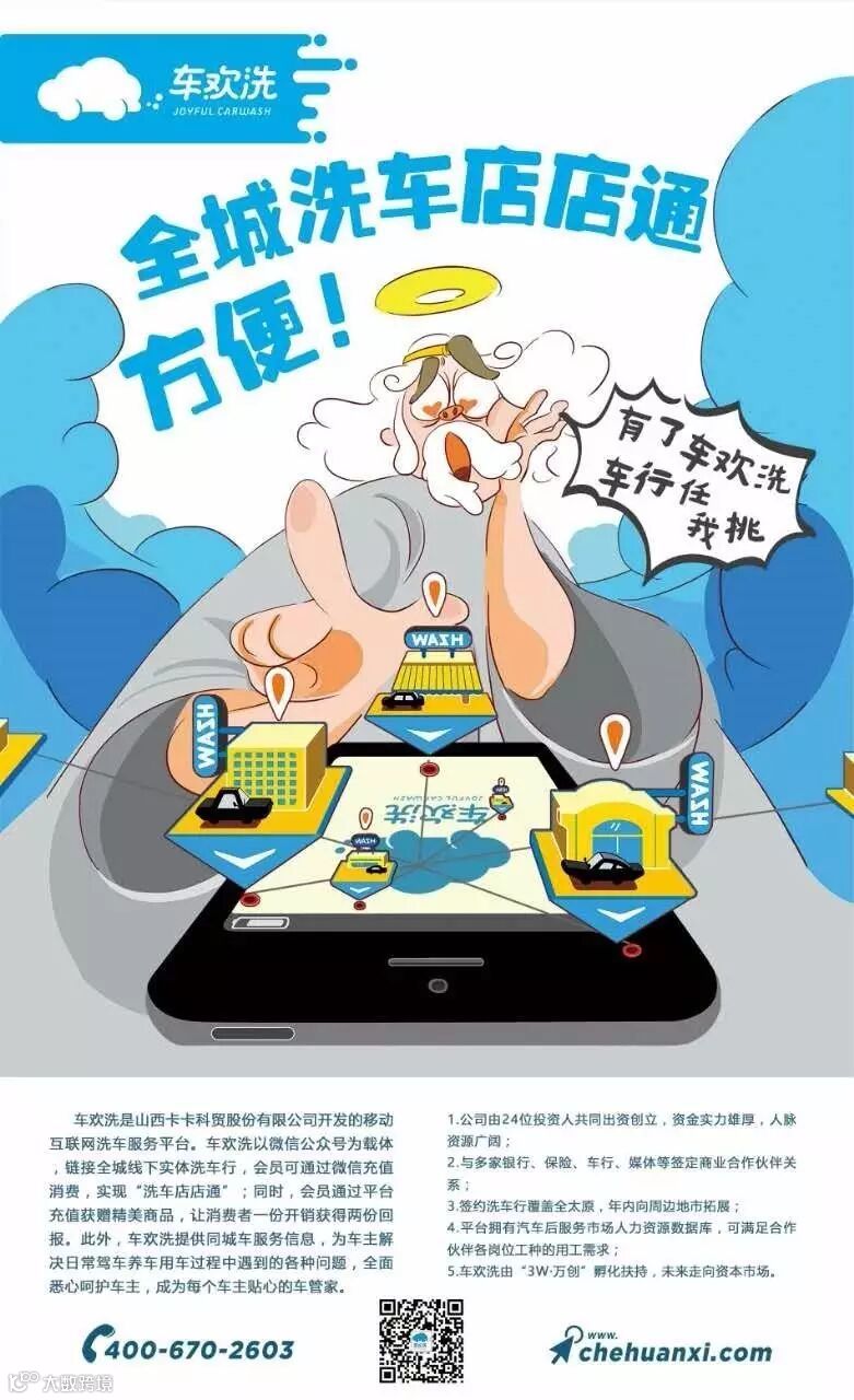 车欢洗是山西卡卡科贸股份有限公司开发的移动互联网洗车服务平台。车欢洗以微信公众号为载体,链接全城线下实体洗车行,会员可通过微信充值消费,实现“洗车店店通”;同时,会员通过平台充值获赠精美商品,让消费者一份开销获得两份汇报。此外,车欢洗提供同城车服务信息,为车主日常驾车养车用车过程中遇到的各种问题,全面悉心呵护车主,成为每个车主贴心的车管家。
