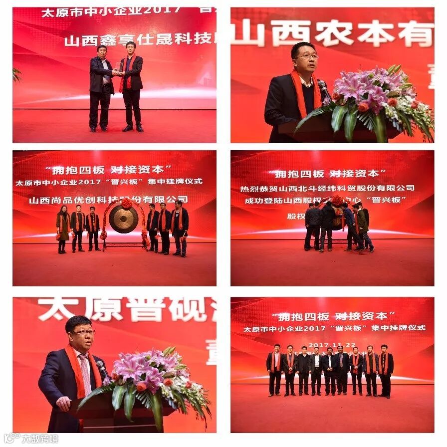 为加快推动太原市中小企业股份制改造工作力度,借助资本市场实现更快发展,11月22日下午,由太原市中小企业局主办,山西股权交易中心和太原高新股权服务中心承办的 “拥抱四板,对接资本——太原市中小企业2017‘晋兴板’集中挂牌仪式”在太原成功举行。省中小企业局、省金融办、省工商联、山西转型综改示范区、太原市中小企业局,太原市金融办等厅局单位的领导,以及太原市100余家中小企业,50余家金融机构、投资机构,共计200余人出席了活动。