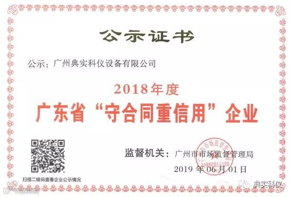 近日,广州市市场监督管理局发表文件,对于2018年度广东省“守合同重信用”企业进行了公示,广州典实科仪设备有限公司凭借自身良好的信用体系建设、诚信守约形象,顺利通过最终评审,获得“广东省守合同重信用企业”,并获颁证书。