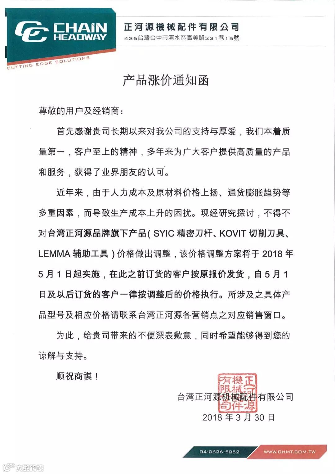 近年来,由于人力成本及原材料价格上扬、通货膨胀趋势等多重因素,而导致生产成本上升的困扰。现经研究探讨,不得不对台湾正河源品牌旗下产品(SYIC精密刀杆、KOVIT切削刀具、LEMMA辅助工具)价格做出调整,该价格调整方案将于2018年5月1日起实施,在此之前订货的客户按原报价发货,自5月1日及以后订货的客户一律按调整后的价格执行。所涉及之具体产品型号及相应价格请联系台湾正河源各营销点之对应销售窗口。