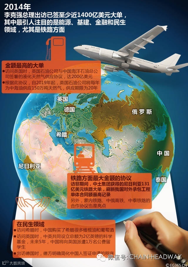 盘点总理今年的五次出访,截至目前,李克强已经带回了至少近1400亿美元的大单,其中最引人注目的是能源、基建、金融和民生领域,尤其是铁路方面。