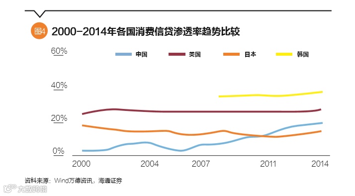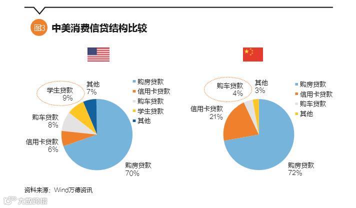 在中美信贷结构比较方面:对比中美的信贷结构,可从消费信贷、房产信贷以及中小微信贷等看出中美信贷市场的区别:美国有一类“学生贷款”占了信贷规模的9%,中国目前也有几家平台在做学生信贷,但模式和美国完全不同,中国学生以消费贷款为主,美国学生信贷以助学贷款为主,之前爆出的大学生开“裸条”贷款,催收后跳楼等现象说明了中国目前的学生信贷市场很不成熟。还有一个明显的差异是在汽车贷款领域,在美国占比8%,中国占比4%,中国整个汽车市场保有量突破了1.5亿台,新车销售的金融渗透率还会进一步上升,二手车2015年的交易量接近1000万台(去除重复交易估计为400万台),金融渗透率估计在10%左右,市场才刚刚起步。中国的消费信贷渗透率在不断上升,目前在20%左右,低于美国和韩国的水平,未来还有巨大的发展空间,尤其是针对目前没有信用卡的蓝领人群。