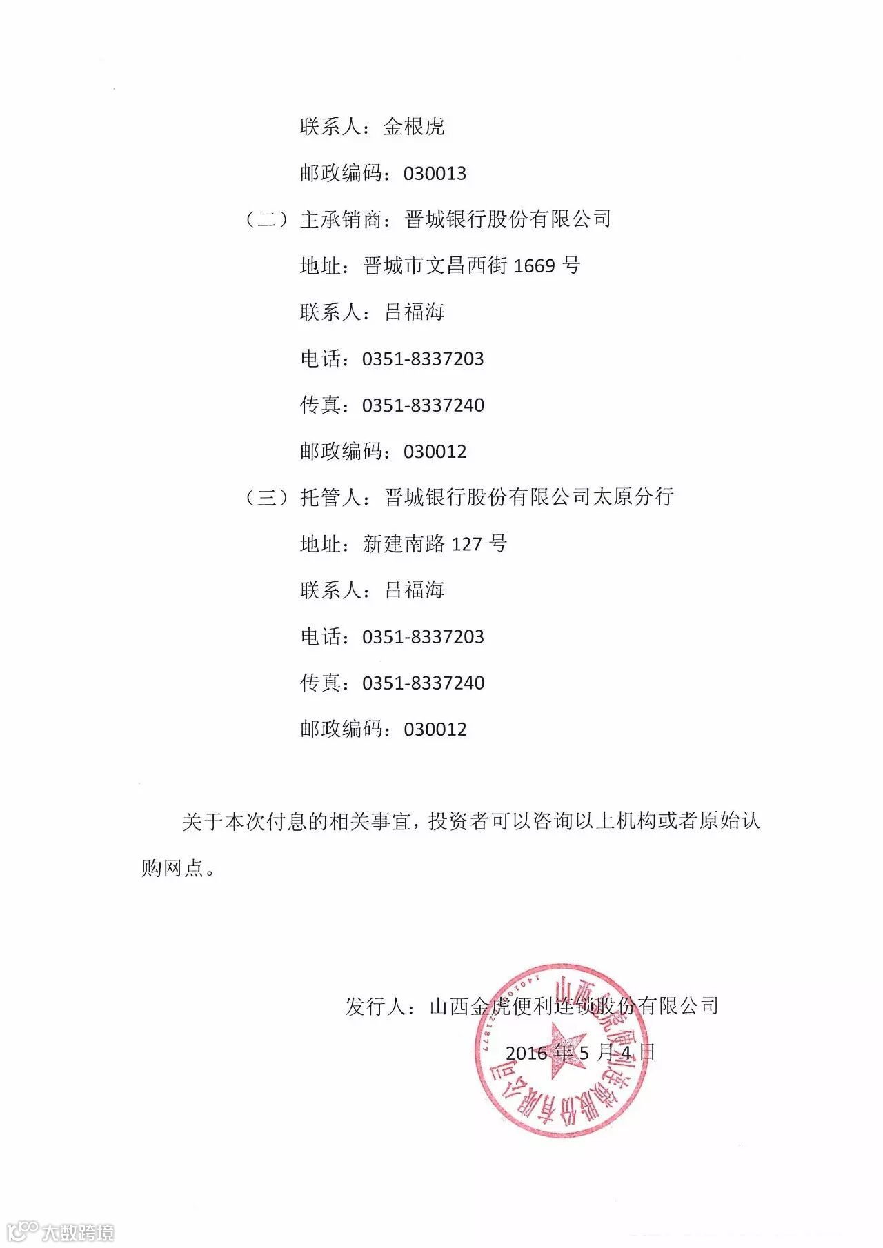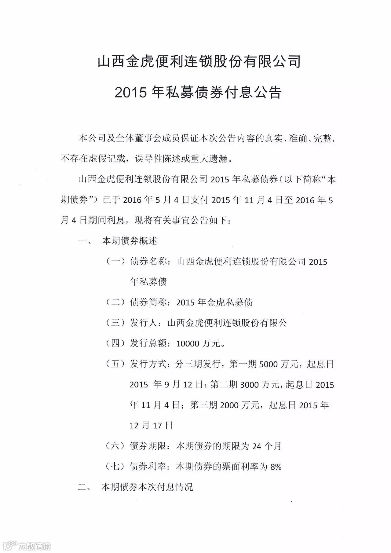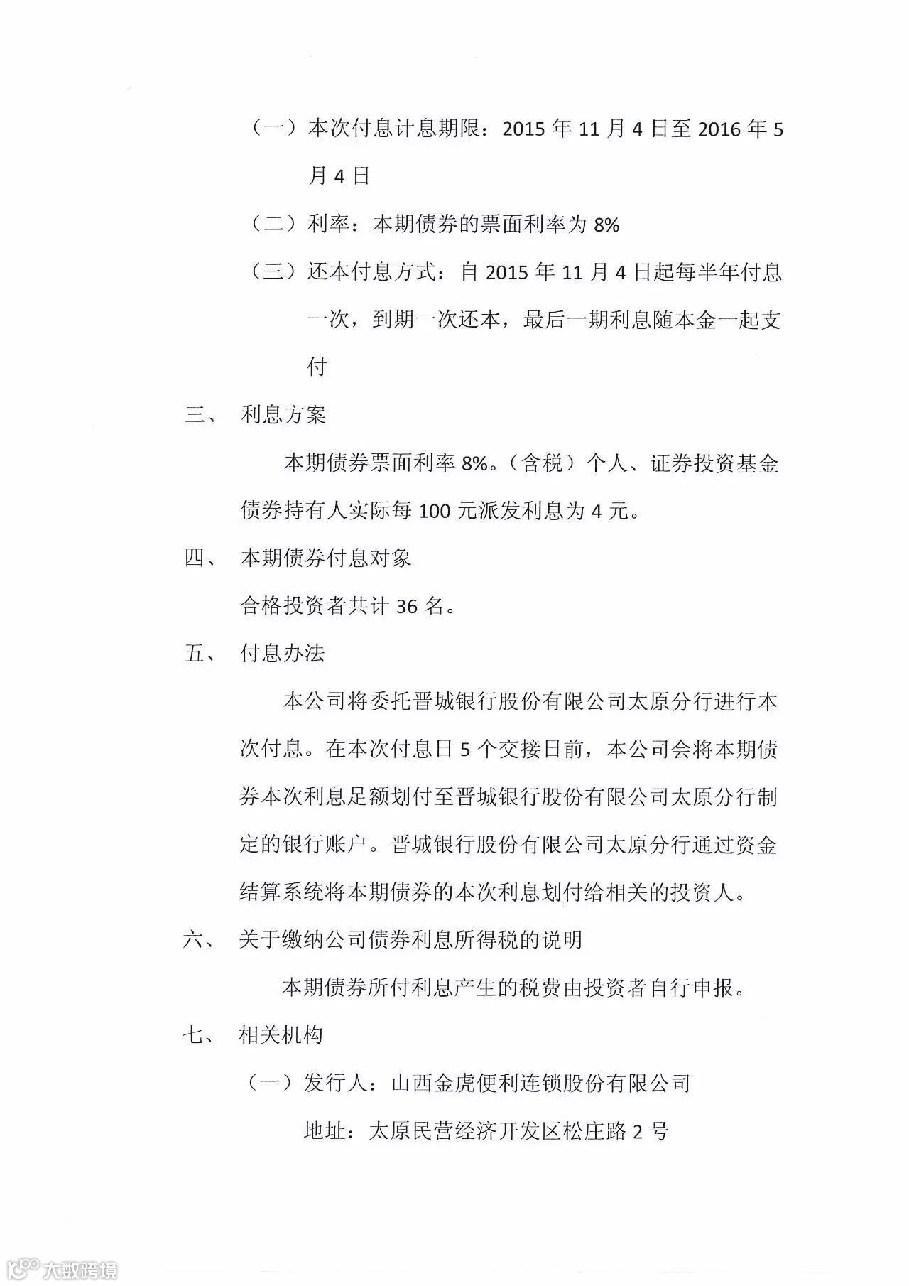 导读:山西金虎便利连锁有限公司2015金虎债02利息兑付公告
