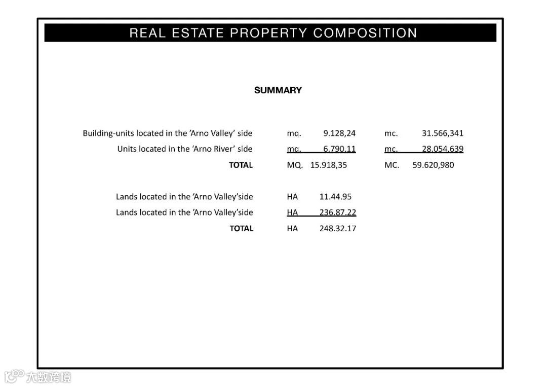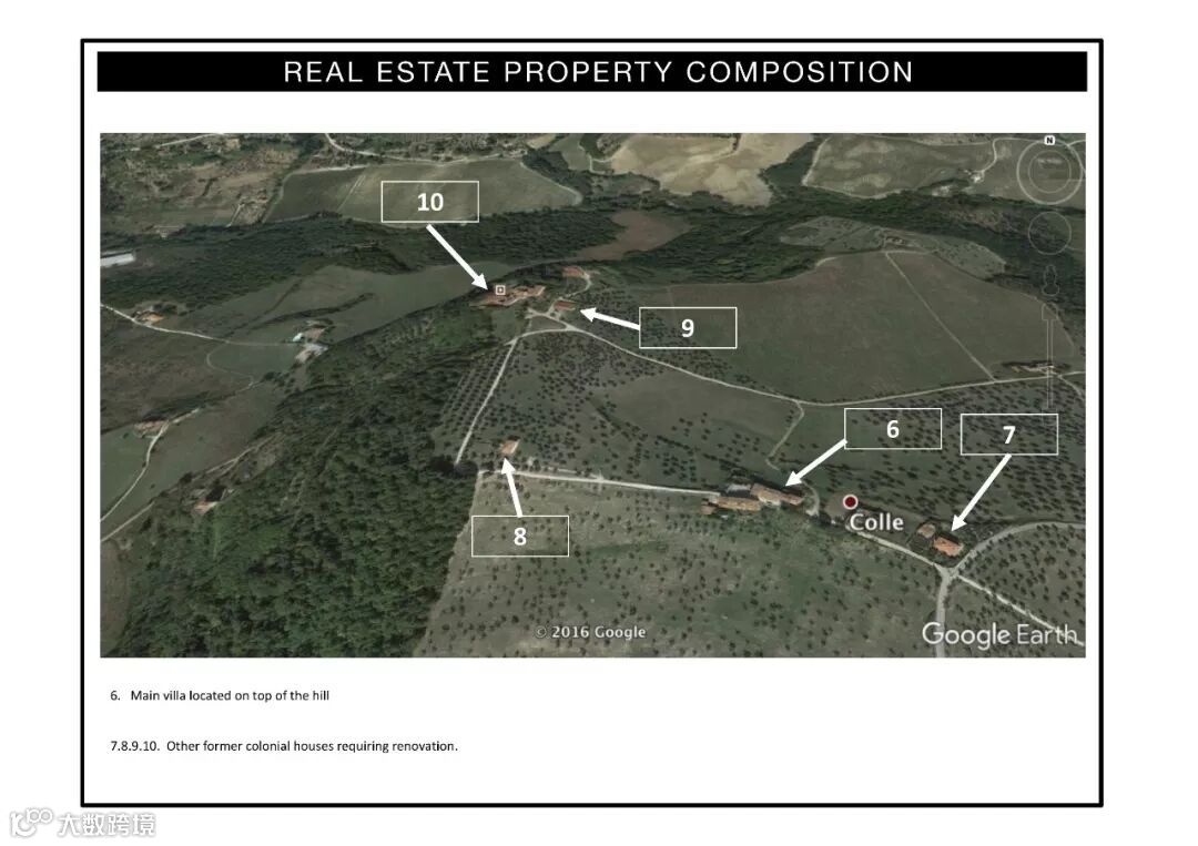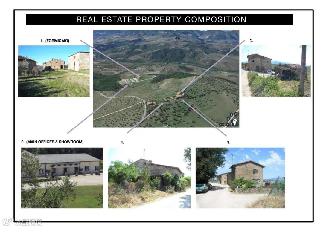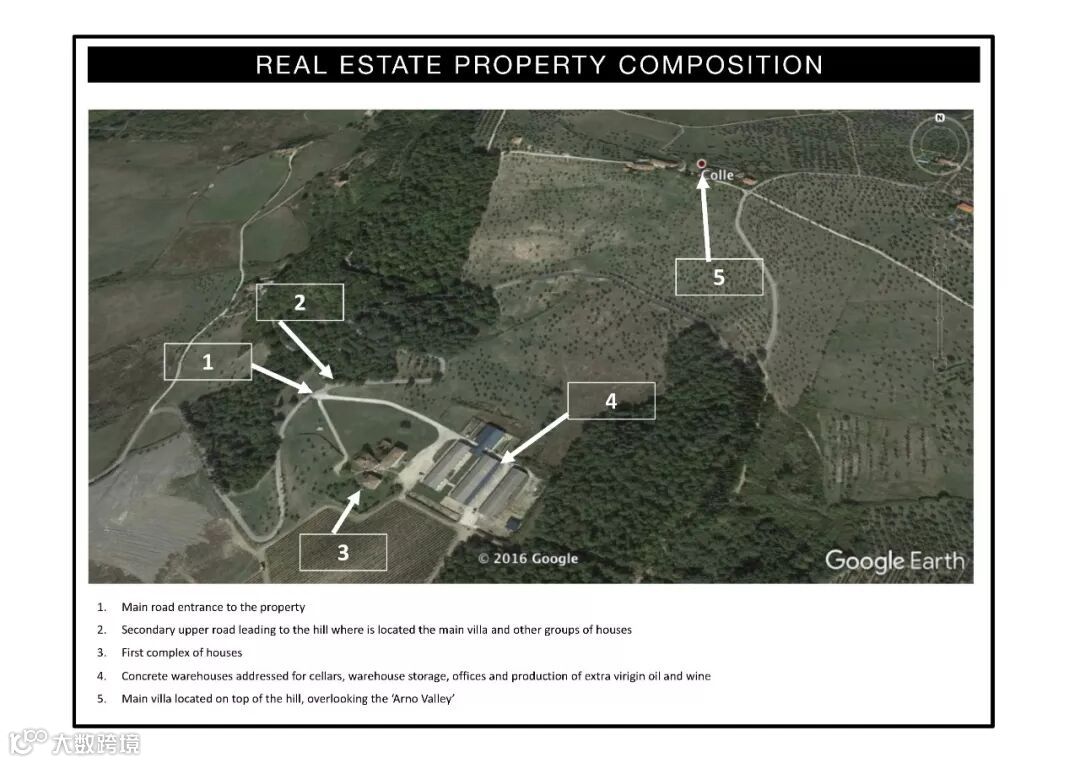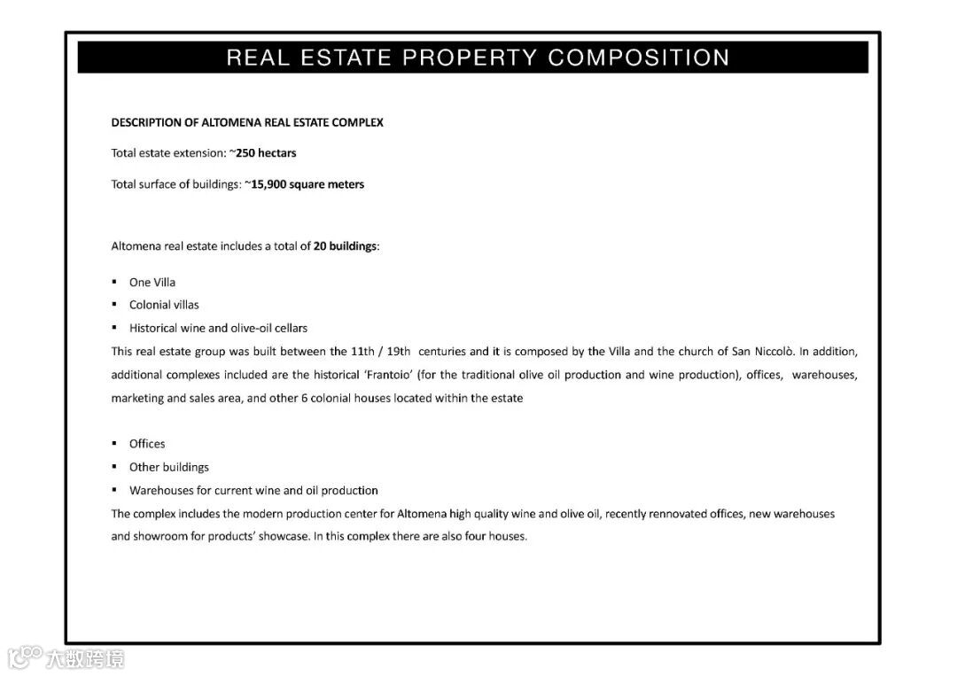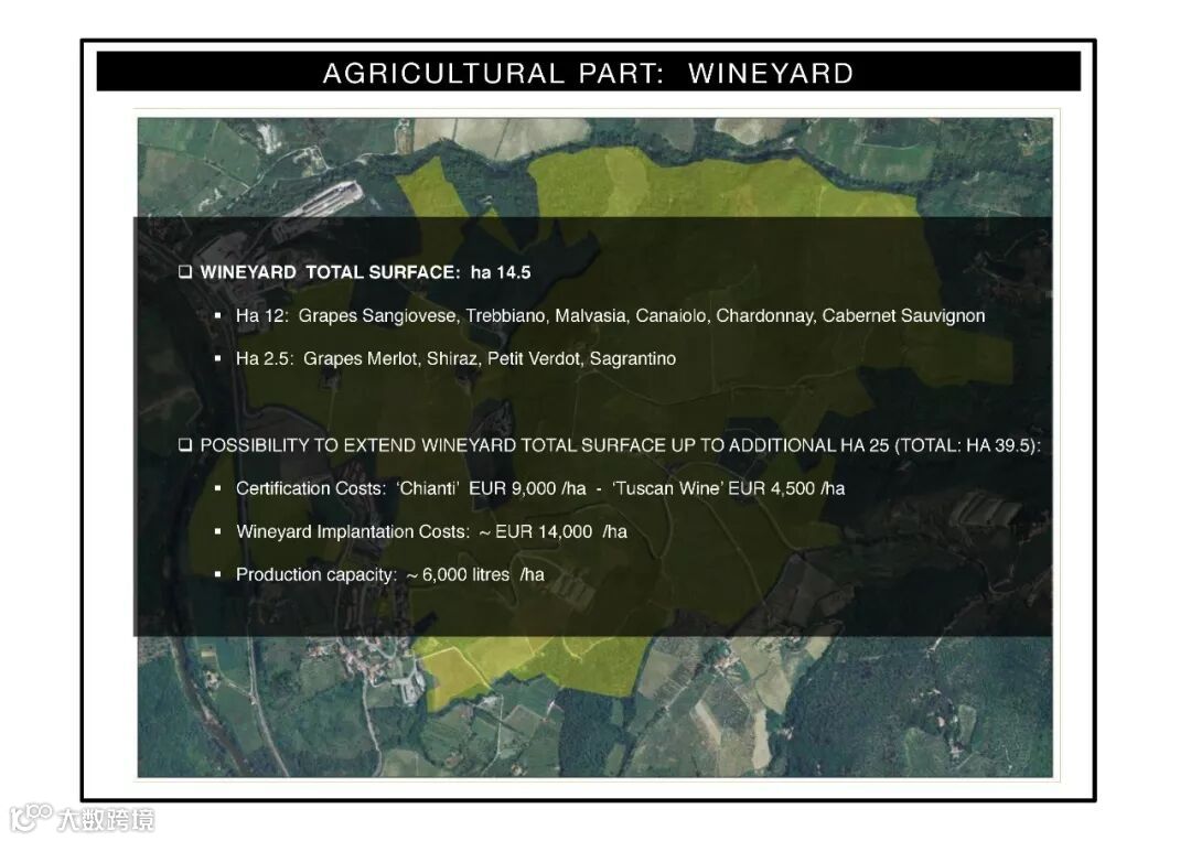 庄园拥有250公顷,除去园内15座独立建筑以外,其余为:60公顷为橄榄园,27公顷葡萄园(可以增加至50公顷葡萄园),其余为弄作物耕地,森林等,售价1300万欧元。