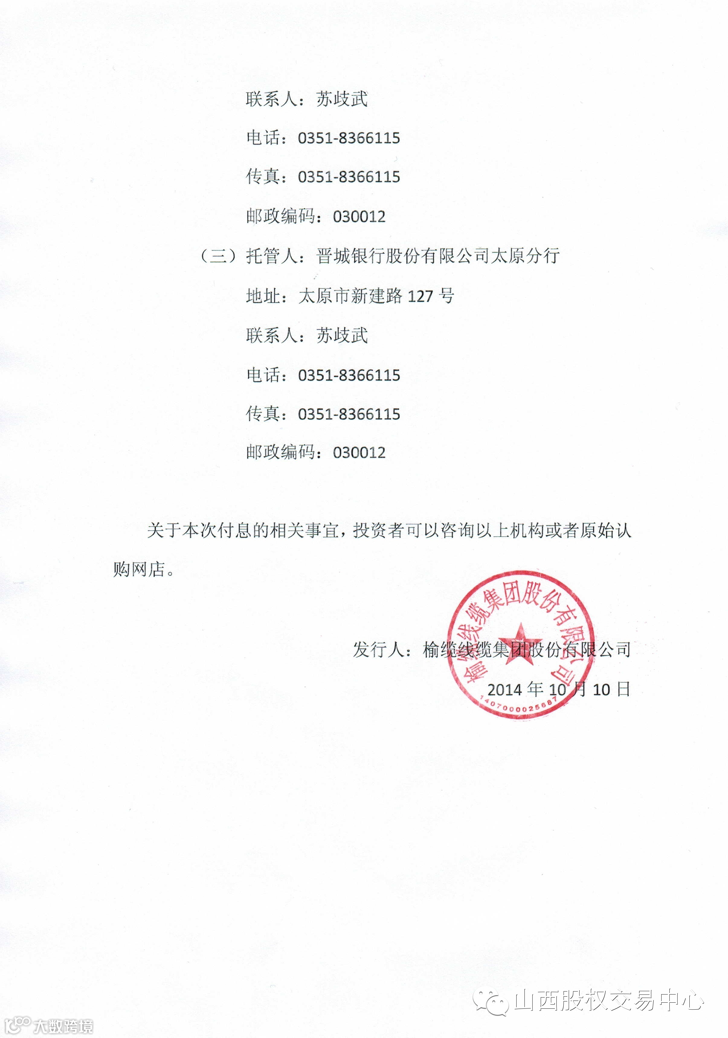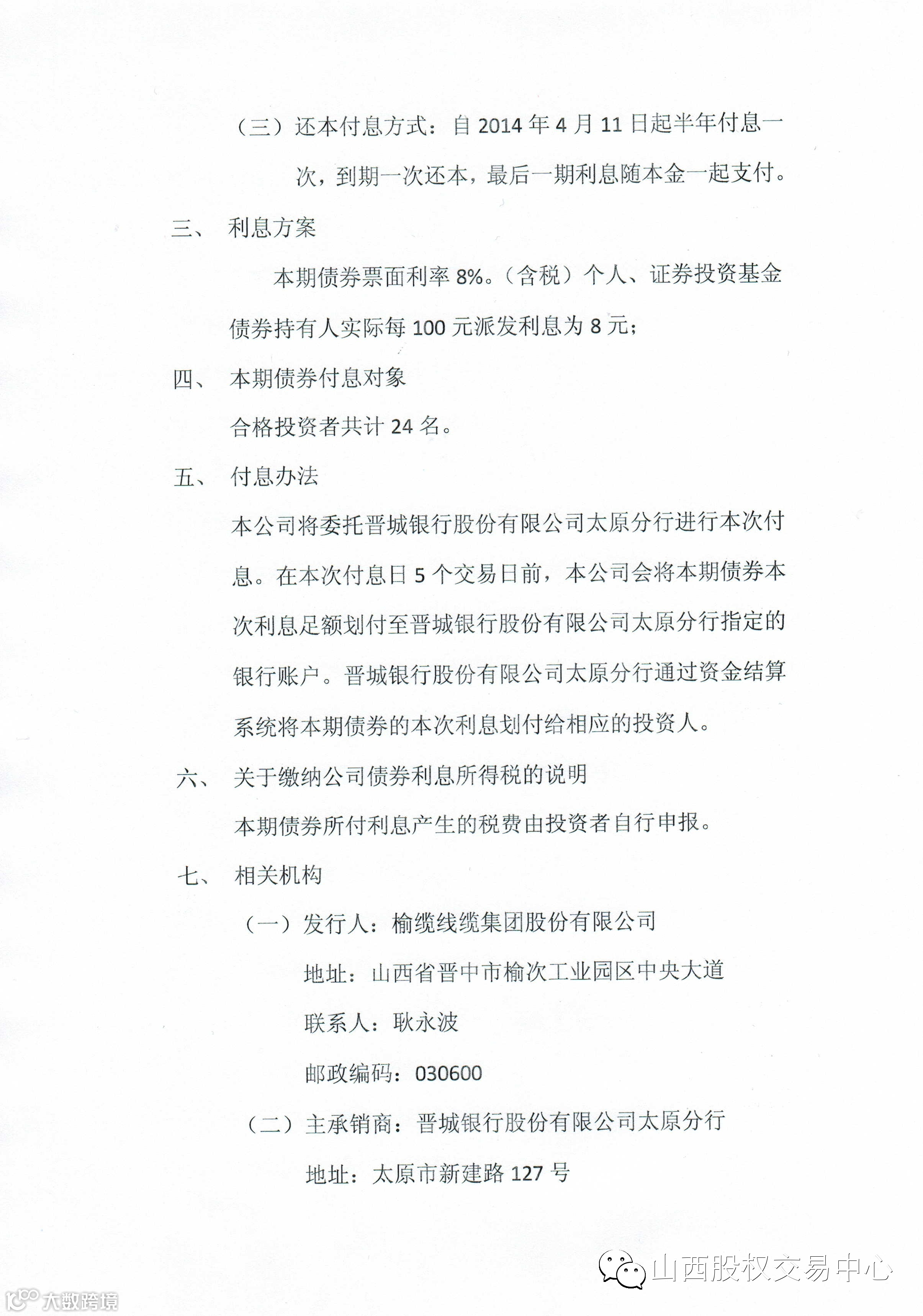 榆缆线缆集团股份有限公司2014年私募债券第二次付息公告