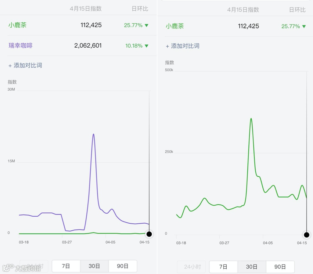 虽然热度与瑞幸差距较大,但用户对小鹿茶的讨论自瑞幸造假案发生后,明显攀升,目前虽有回落,但余温仍在。