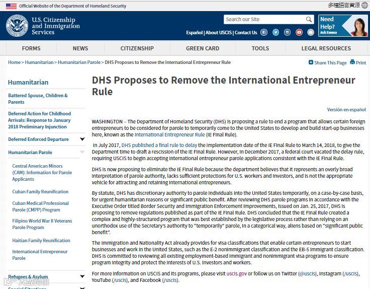 美国当地时间5月25日,美国移民局(USCIS)官网发布消息,称美国土安全部(DHS)已提议废除《国际企业家规则》。