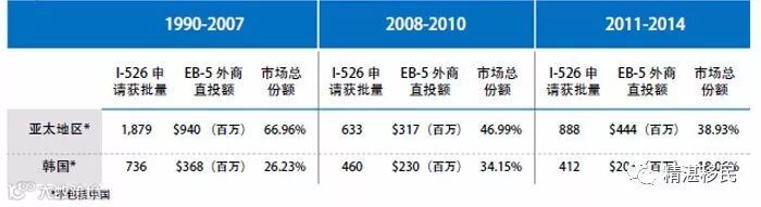 EB-5 项目开设以来,韩国市场一直以最高的 I-526 申请获批量位居东亚地区首座,直至 2008 年,这一纪录才被打破。2007 年,亚太地区获批的 I-526 申请 85% 以上来自韩国,但此后,其市场份额开始下降。2013 年,韩国 EB-5 投资仅占该地区总投资的50%,到 2014 年,这一数值进一步下降至 30%。