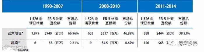 2014 年,越南的获批量约占整个亚太地区 EB-5 市场的 30%。忽略货币限制这一因素,过去几十年间,越南吸引了大笔外商投资,富裕了一批人。财富的涌入使得越南人有财力移民。自 1980 年以来,移居美国的越南人超过 1,200,000。综合上述因素,越南仍将在 EB-5 投资市场上活跃。